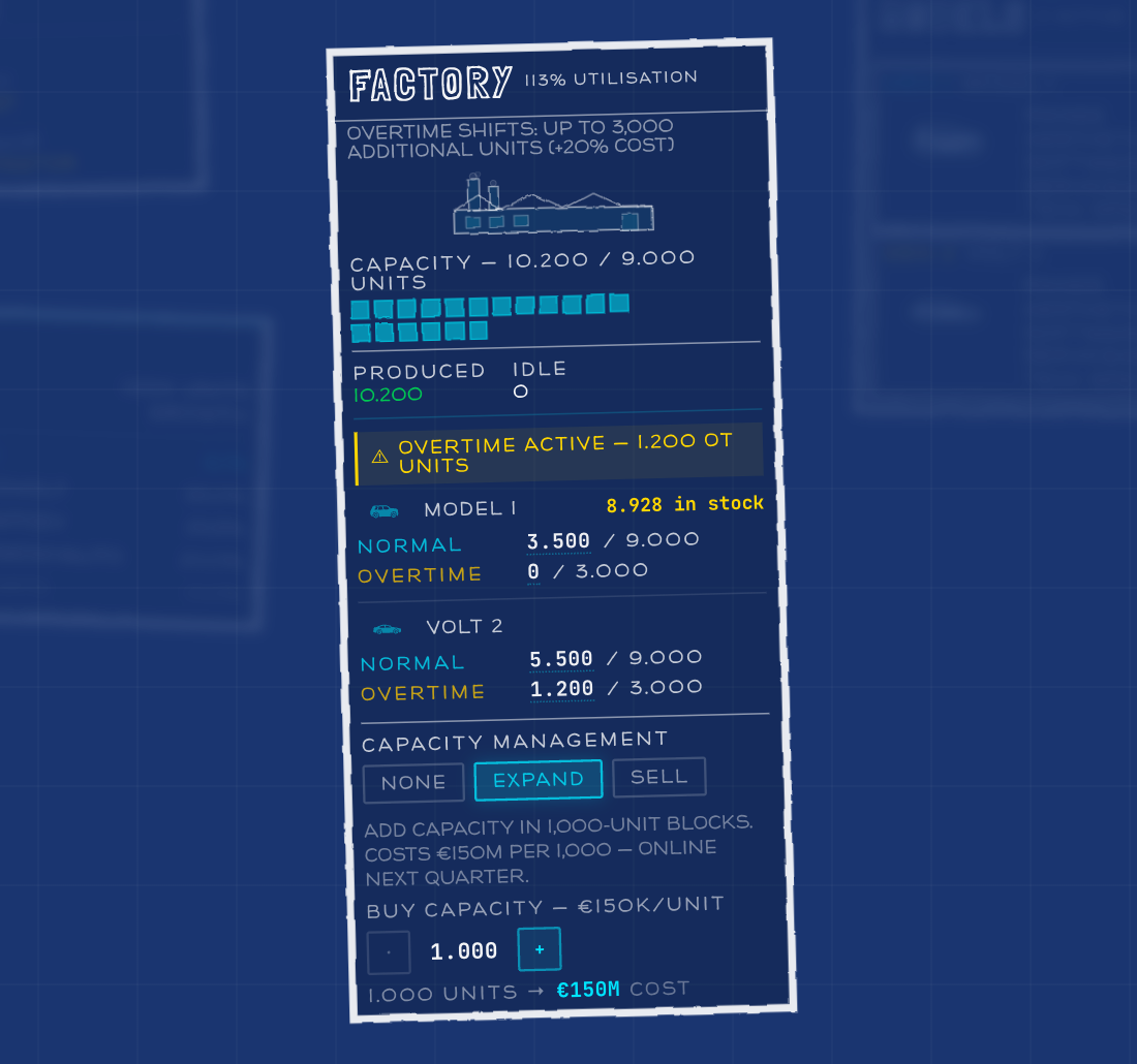 Quarter 9. Import tariffs just hit. Your COGS jumped 18%. Your rival undercut your price by €3k. You have two quarters of cash runway and a factory running at 40% capacity. What do you do?