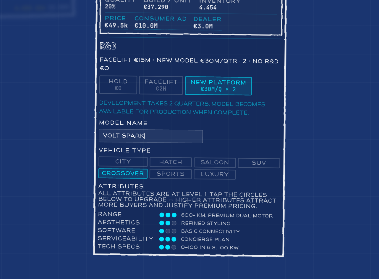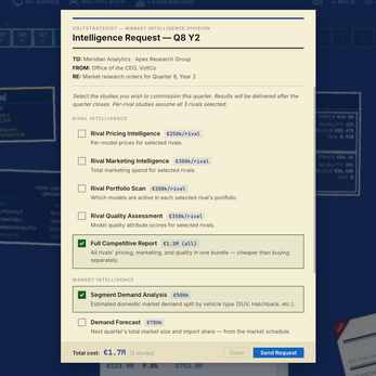 VoltStrategist is a browser-based business sim where you run an EV company through 24 quarters of real market competition — pricing, production, R&D, and rivals that actually fight back. One session. 90 minutes. Every decision closes with a real income statement.